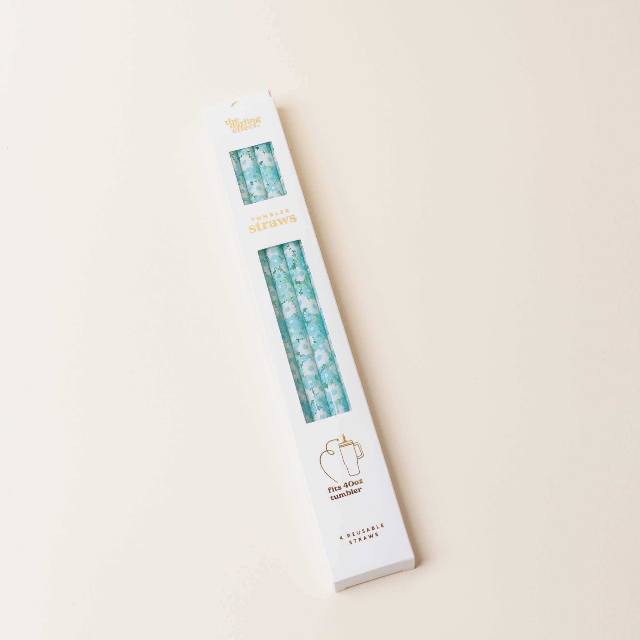 Set of 4 printed straws Fits 40 oz tumblers Coordinate with matching tumbler Eco friendly, reusable Height: 12” Diameter: ⅜”