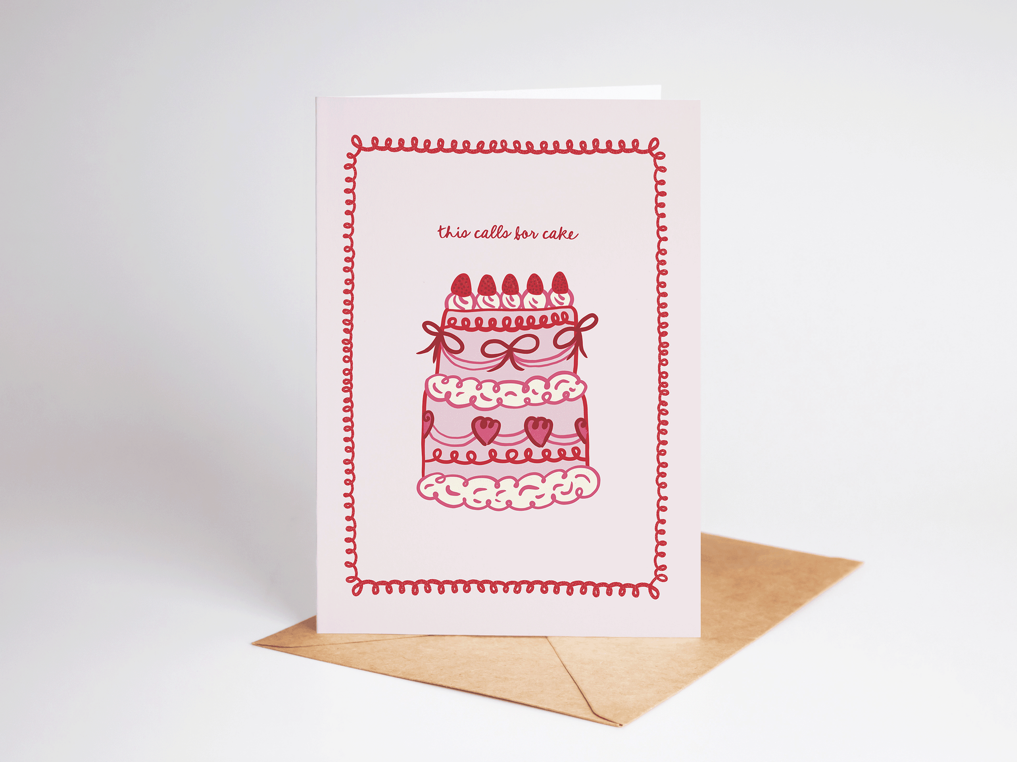 Give someone a sweet wish with this red and pink 5x7 card, featuring a sweet cake topped with bows and raspberries and the phrase "this calls for cake". The card is blank inside for your own personal message, and comes with a brown kraft envelope. Perfect for birthdays, coquette celebrations, dessert lovers, promotions, and more! Details: Size: A7; measures 5x7 inches folded Blank Inside Includes: Brown kraft envelope Comes packaged with envelope in clear plastic sleeve for protection All The Shelley Society greeting cards feature original artwork by artist Lauren Shelley