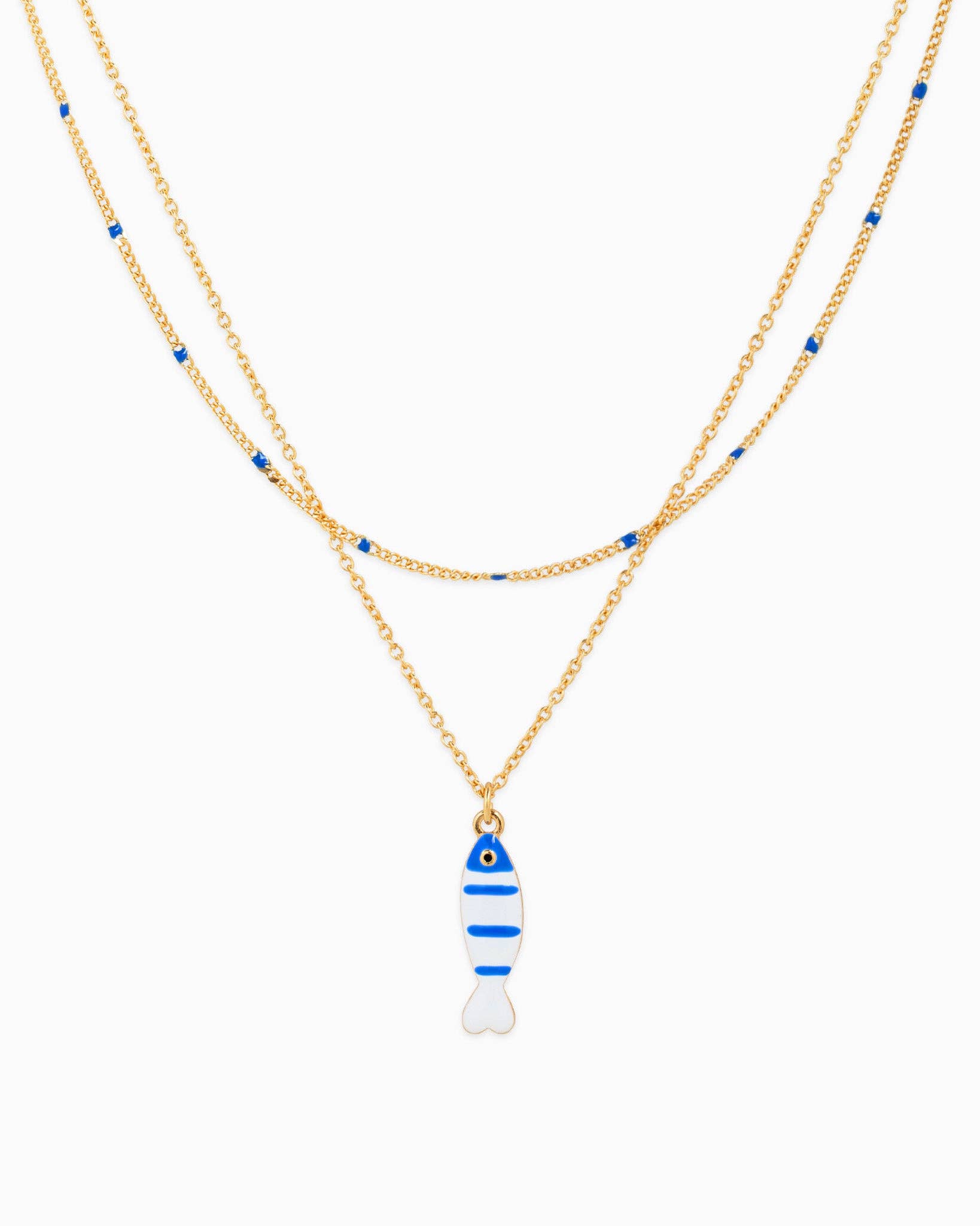 Double-layered necklace featuring a gold-tone chain with marine blue enamel accents and a striped fish charm pendant. Material: Steel, Enamel, Zinc Size: 15/16"Length, 7*24MM Pendant
