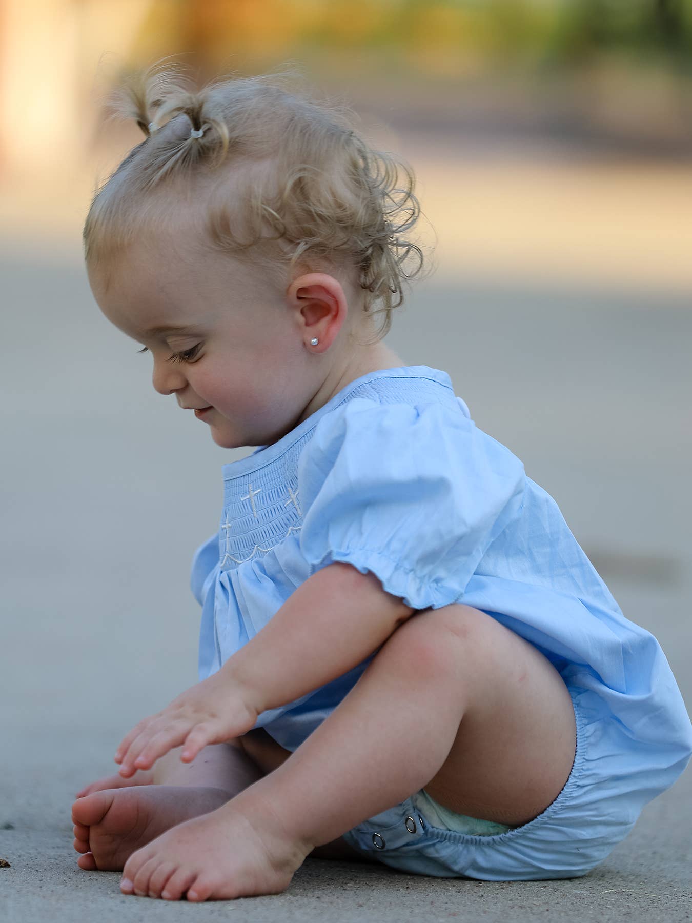 Add a touch of elegance to your little one's wardrobe with our Girls Cross Smocking Embroidered Blue Romper. Featuring delicate smocking and intricate embroidery, this romper is both stylish and comfortable. Perfect for any occasion, your princess will look and feel like a true fashionista! SKU:RPG51777 Material: 100% Cotton