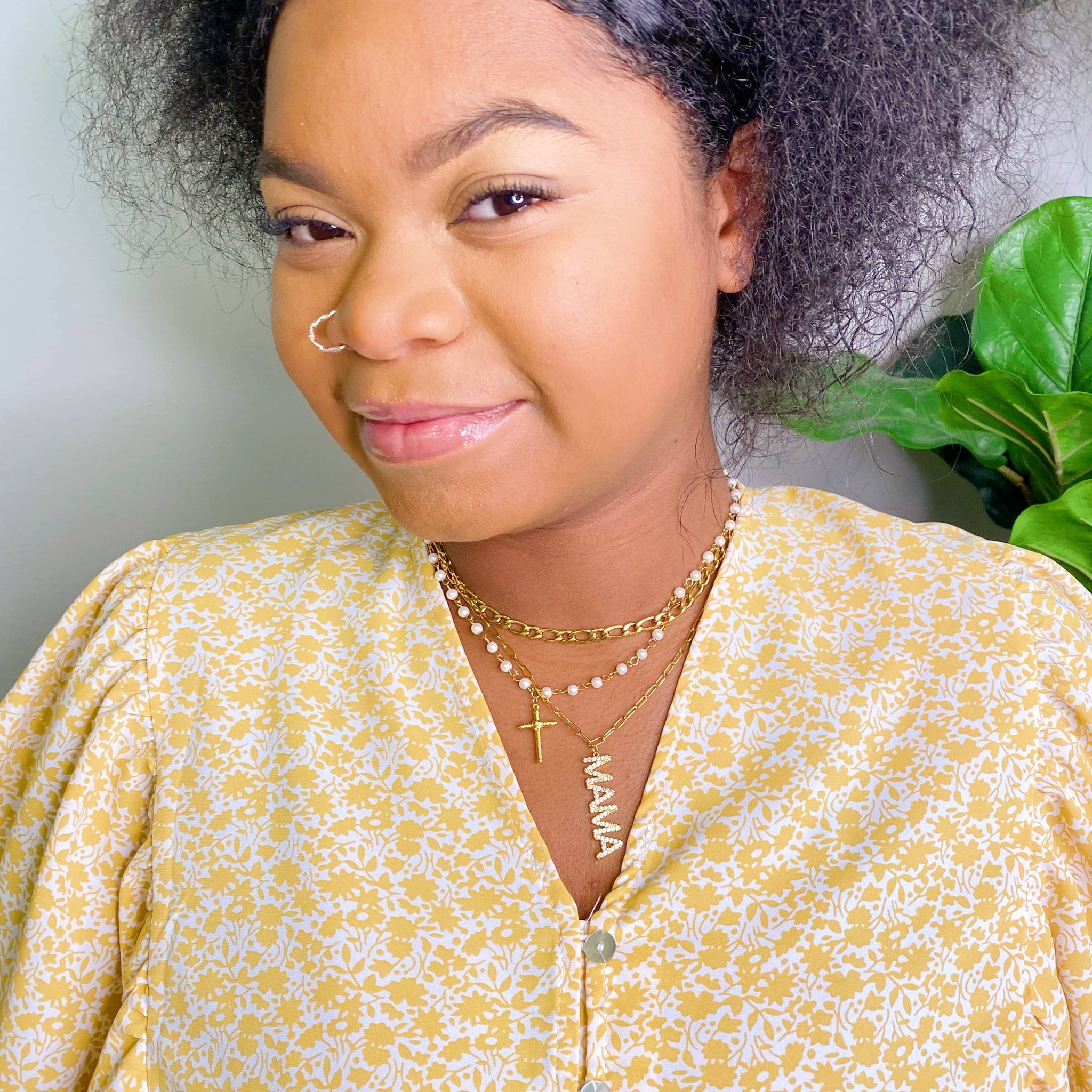 Features a unique cable-textured cross pendant with a gorgeous mixture of pearls in the chain. It has a boho and delicate aesthetic. Pendant, same front and the back. Chain approximately 16” long with a 2” extender Pendant 0.75” drop 18k Gold plated Brass, high quality glass pearls Lead and Nickel free