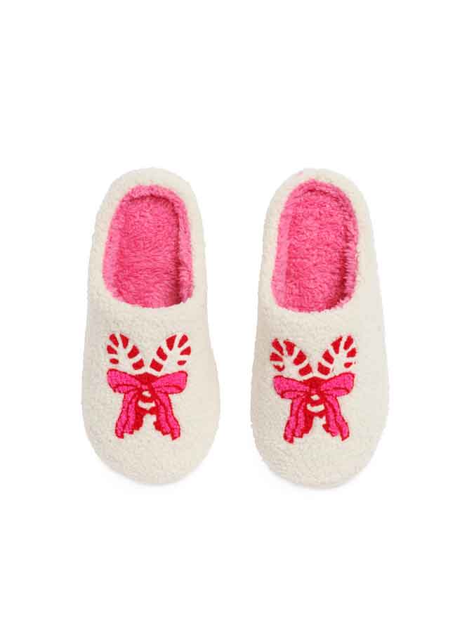 Made from polyester and TPR, Step into holiday cheer with our Candy Cane Slippers, the sweetest treat for your feet. These cozy ivory slippers feature a festive embroidered design of two crossed candy canes tied up with a bright pink bow. Lined with plush fleece in a bubblegum pink hue, they’re as soft and snuggly as they look. Whether you're wrapping gifts or sipping cocoa, these slippers are the perfect finishing touch to your holiday loungewear.