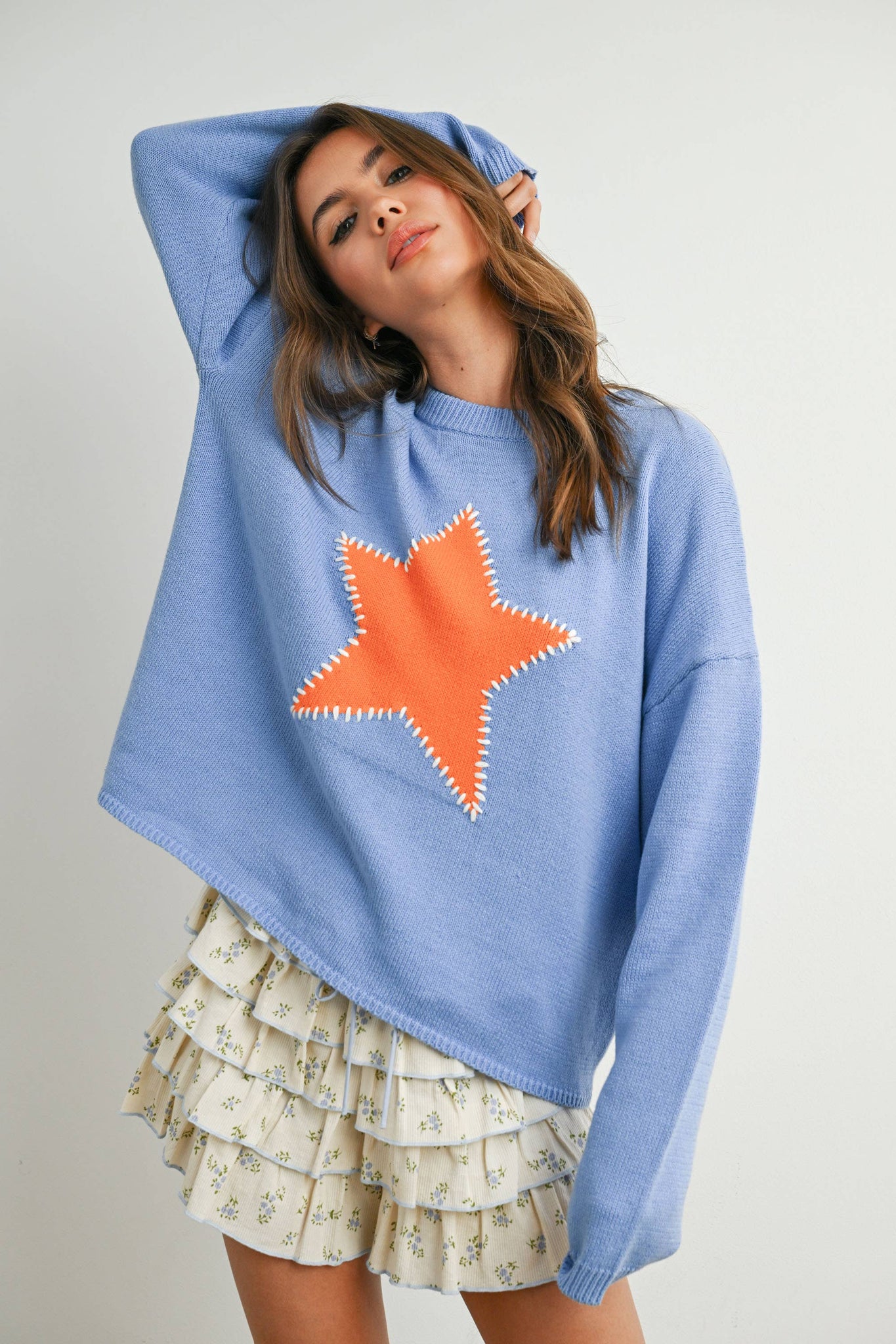 Cozy up in style with this drop shoulder star pattern sweater. Featuring a relaxed fit and soft knit fabric, it's designed for all-day comfort. The bold star print adds a fun, playful touch, while the drop shoulder design gives it a laid-back, effortless vibe. Perfect for layering on cooler days or making a statement in your everyday look.