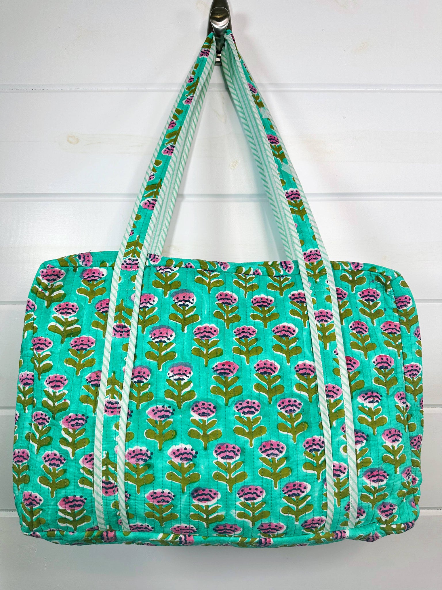 Travel in style with our Aqua Floral Quilted Duffle Bag, a boutique favorite that blends artisan craftsmanship with modern functionality. Featuring a vibrant aqua backdrop adorned with whimsical floral handprinted designs, this weekender is both eye-catching and practical. Spacious yet lightweight, it’s the perfect carryall for overnight stays, weekend getaways, or light travel.