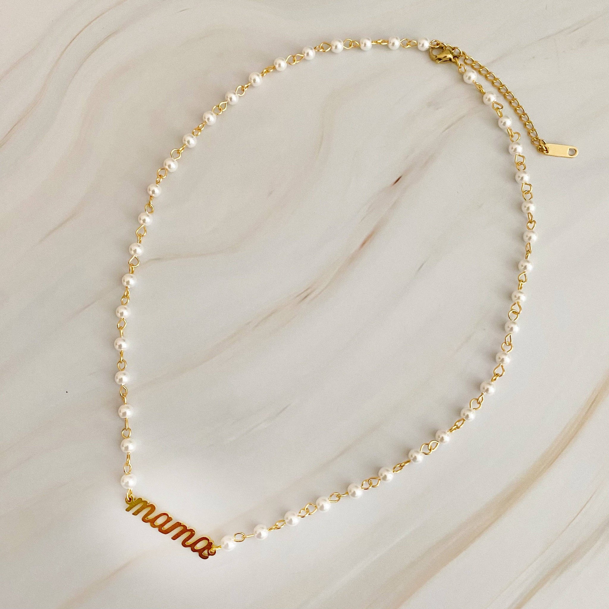 This Mama Pearl Chain Necklace features a beautiful pearl chain with a scripted MAMA cutout pendant, making it the perfect accessory for stylish moms. The elegant design works great as a statement piece on its own, or layered with other necklaces. Gift your mom with an elegant accessory she will love.