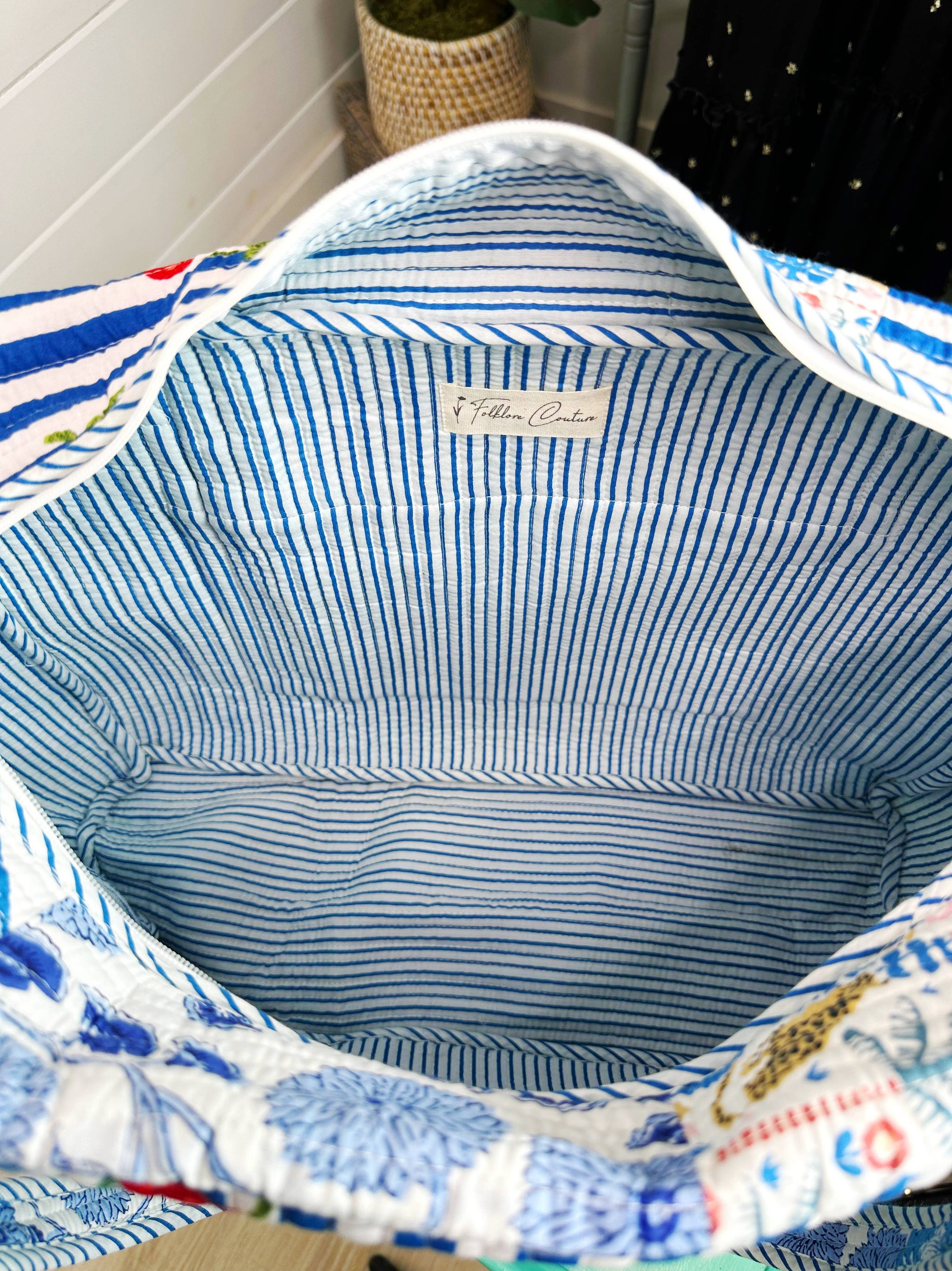 This spacious bag is ideal for overnight stays, weekend getaways, and light travel. Crafted from 100% cotton, featuring a hand block print with contrasting trim and interior. The exterior zipper pocket and secure zipper top closure ensure your essentials are easily accessible and safe.