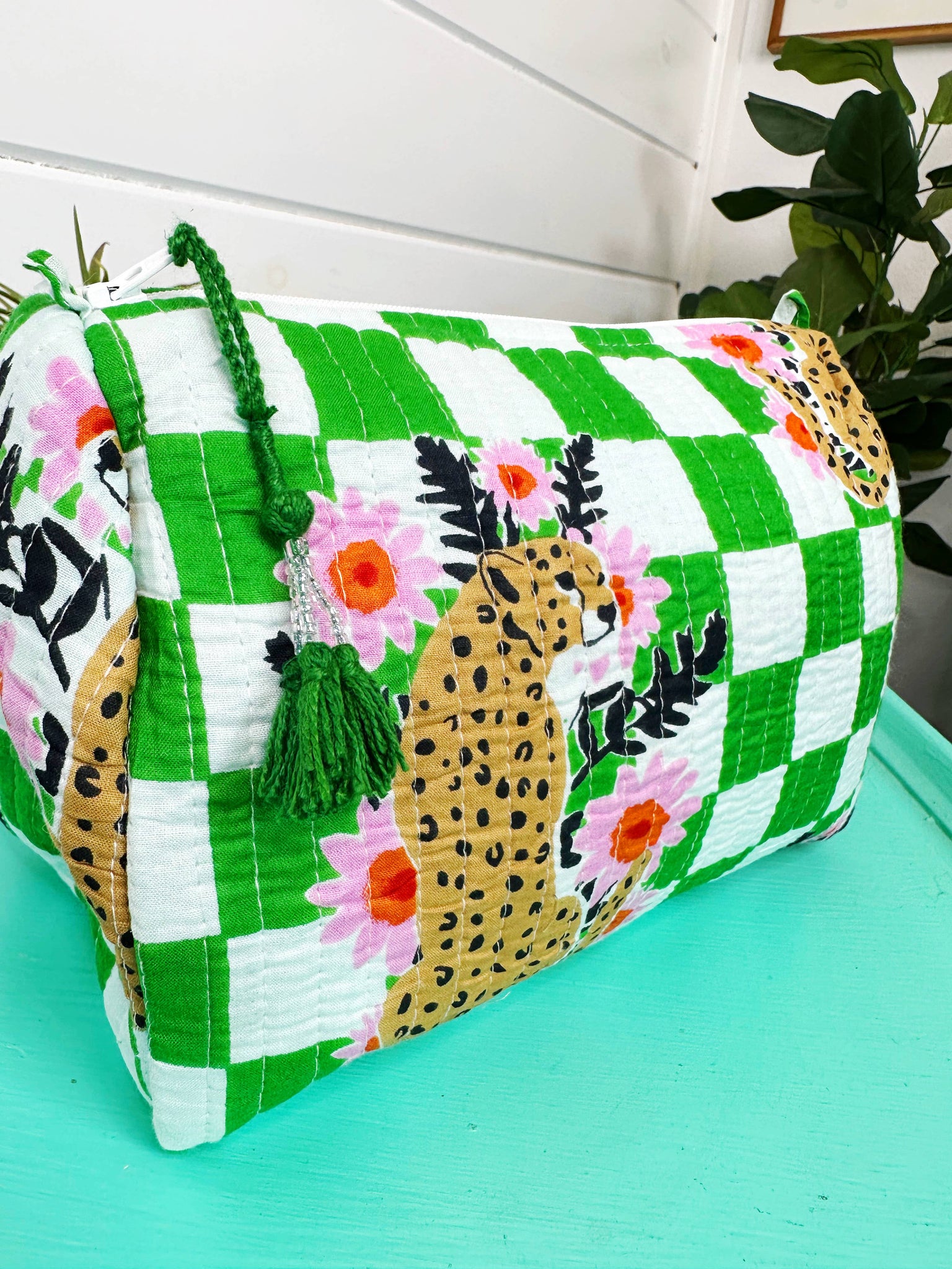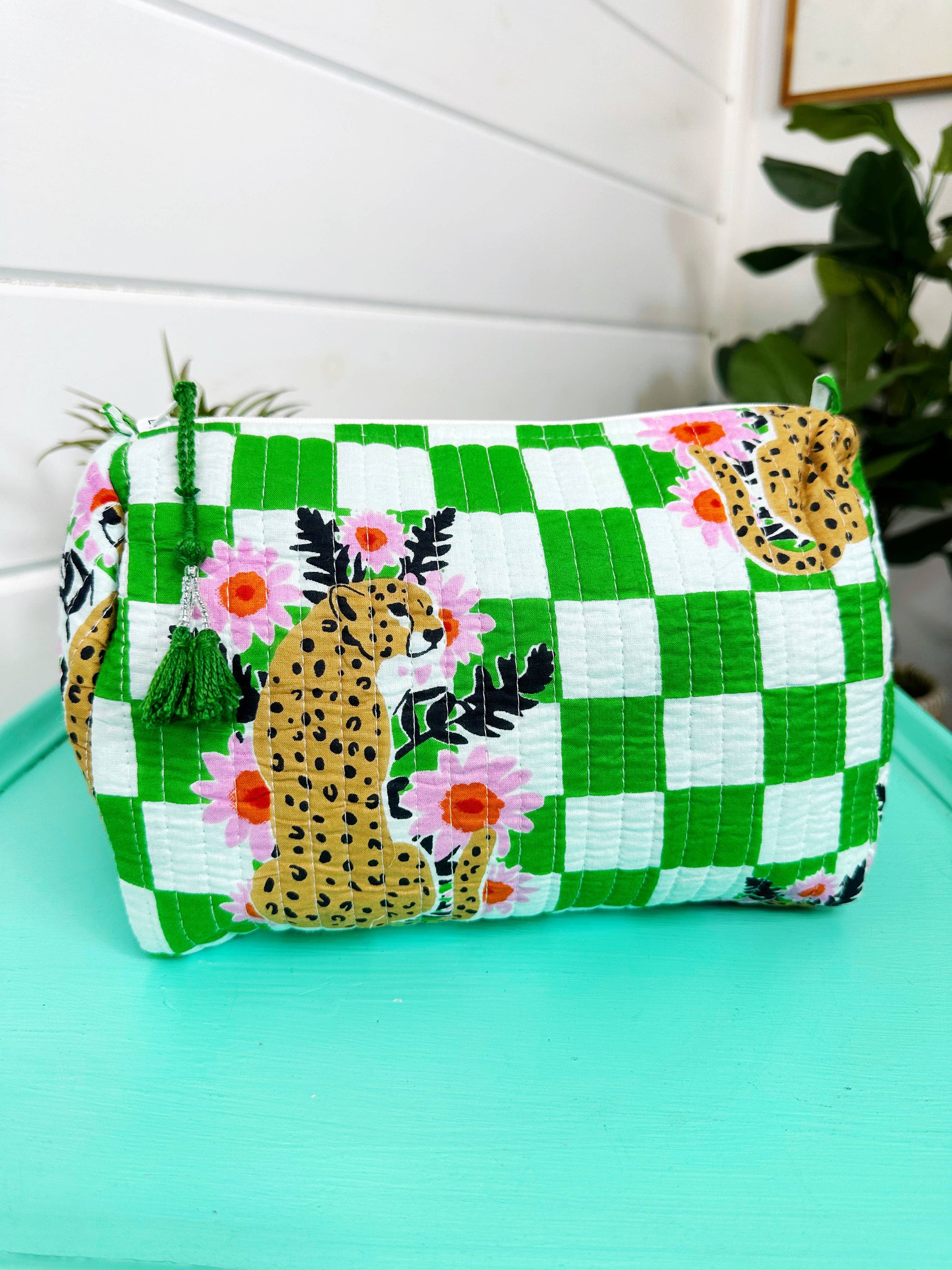 Green Checkered Jaguar Print Quilted Cosmetics Bags: