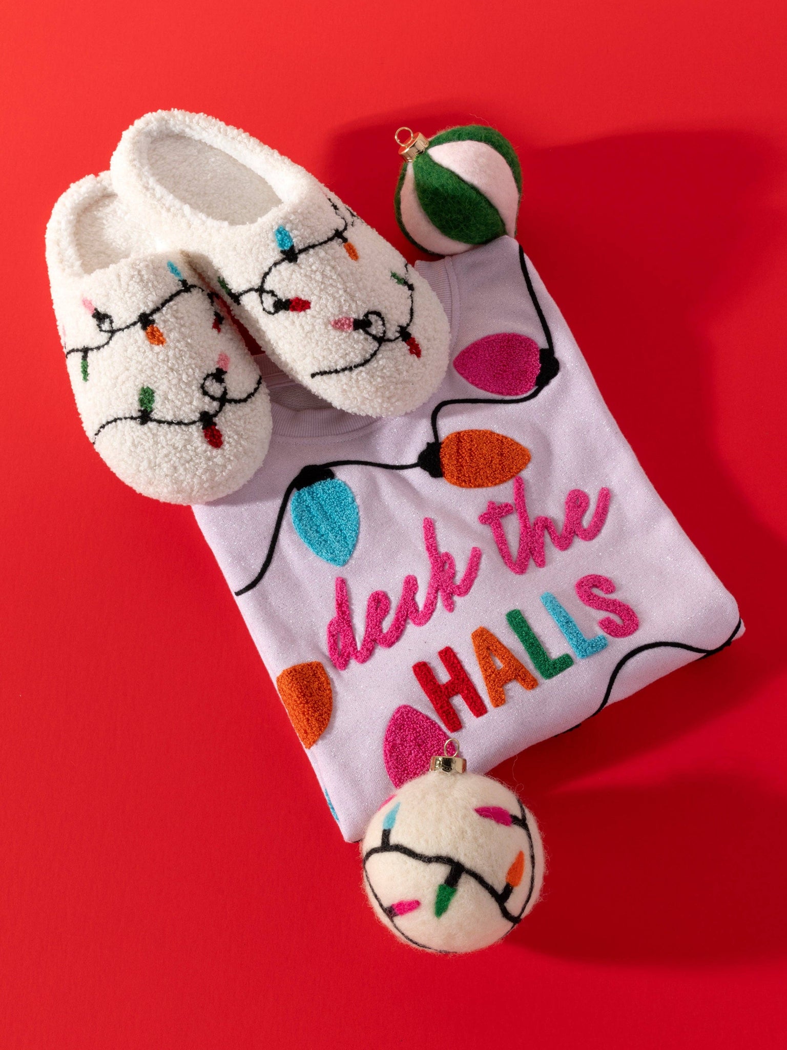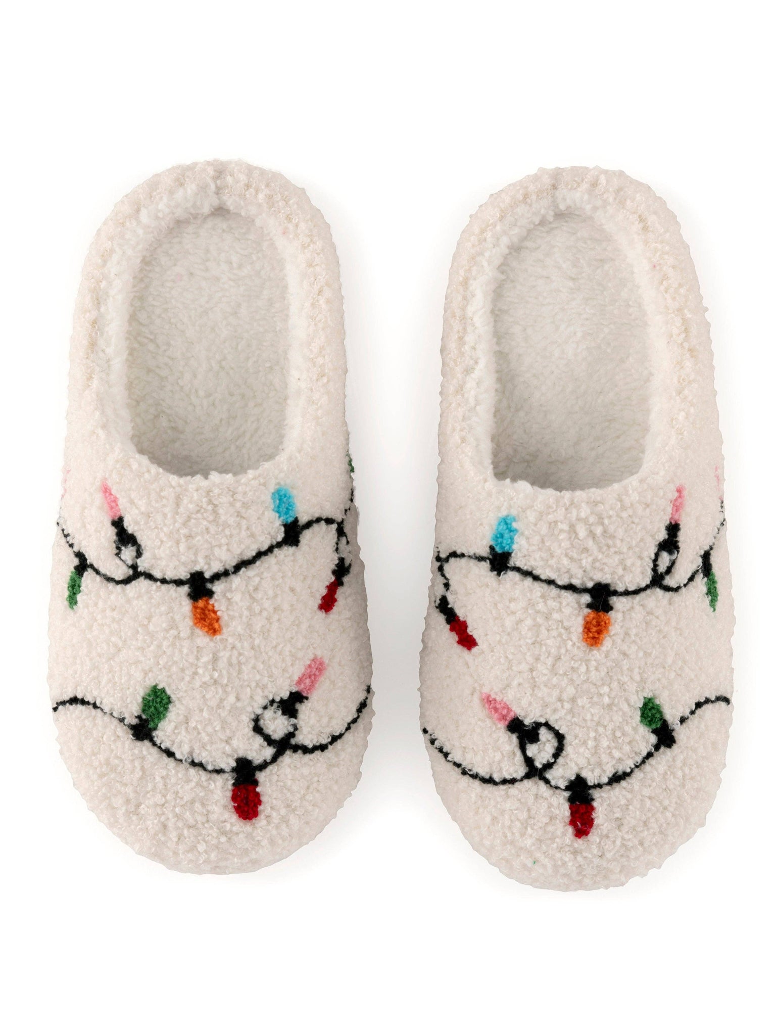 Celebrate the holiday season in comfortable style with Shiraleah's String Lights Slippers. Made from a chic white fabric with a plush sherpa texture, these closed toed house shoes feature an adorable embroidered design of multicolored Christmas lights strung across either foot. With a hardened rubber sole, these slip-on house shoes are as sturdy as they are chic. Pair with the matching String Lights Socks, or other items from Shiraleah’s Merry Everything collection to complete your look!