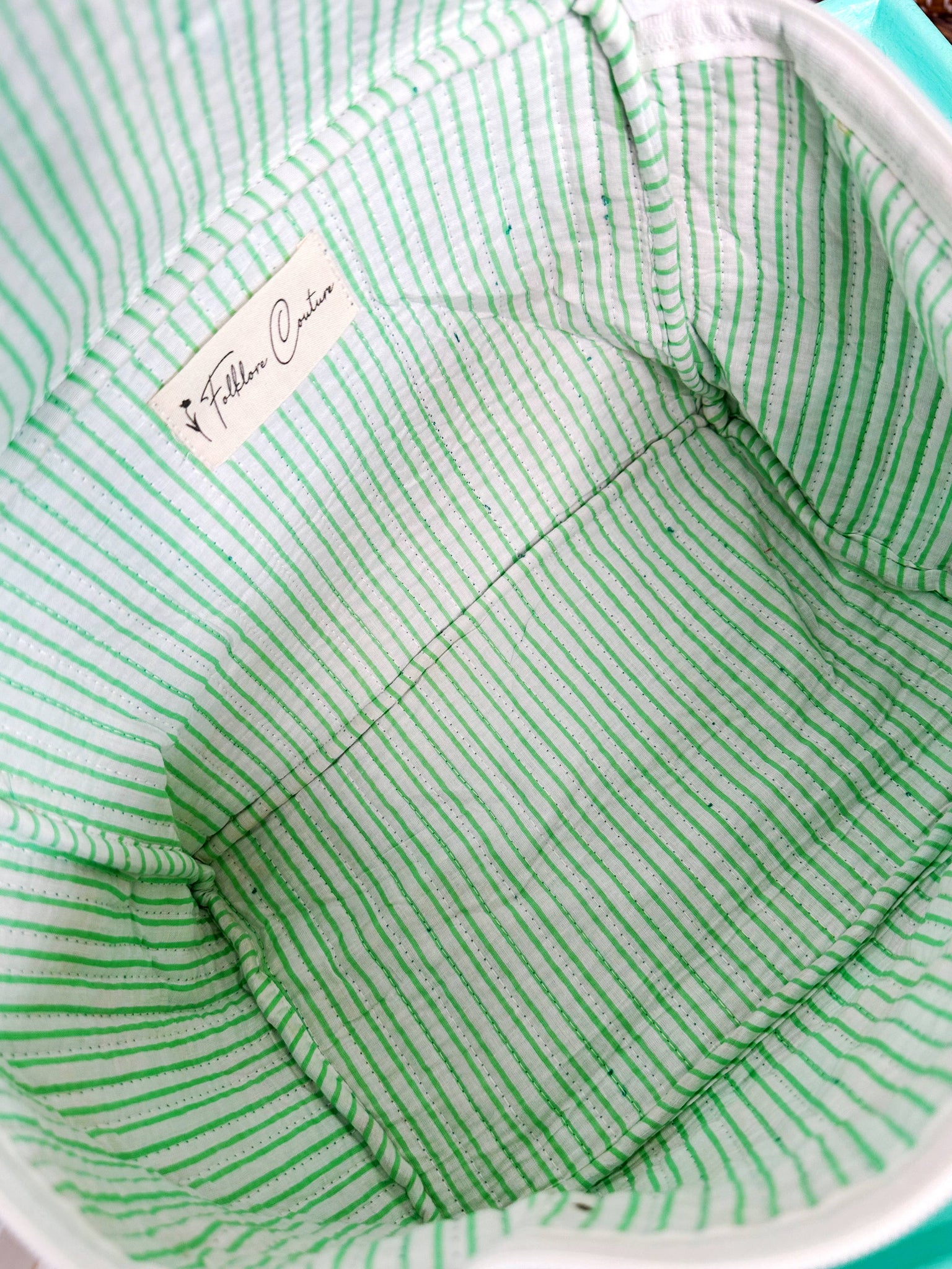 Quilted Travel Toiletry Bag, Case with handle - Aqua Floral Print: - Zipper closure with tassel - Approximate dimensions: 10.5" x 8" x 6" - Cotton, quilted fabric exterior Perfect for: traveling, cosmetics bag, toiletries, organizing & more! Great to sell for gift shop items, upscale boutiques, birthday gifts, embroidery blanks & more! Our quilted pieces are handmade by Indian artisans. The cotton fabrics are handprinted and proudly sustainably made. Folklore Couture is based in Lake of the Ozarks, Missouri. There may be some variations and print placement may vary by bag. Handmade in small batches, prints are very limited.