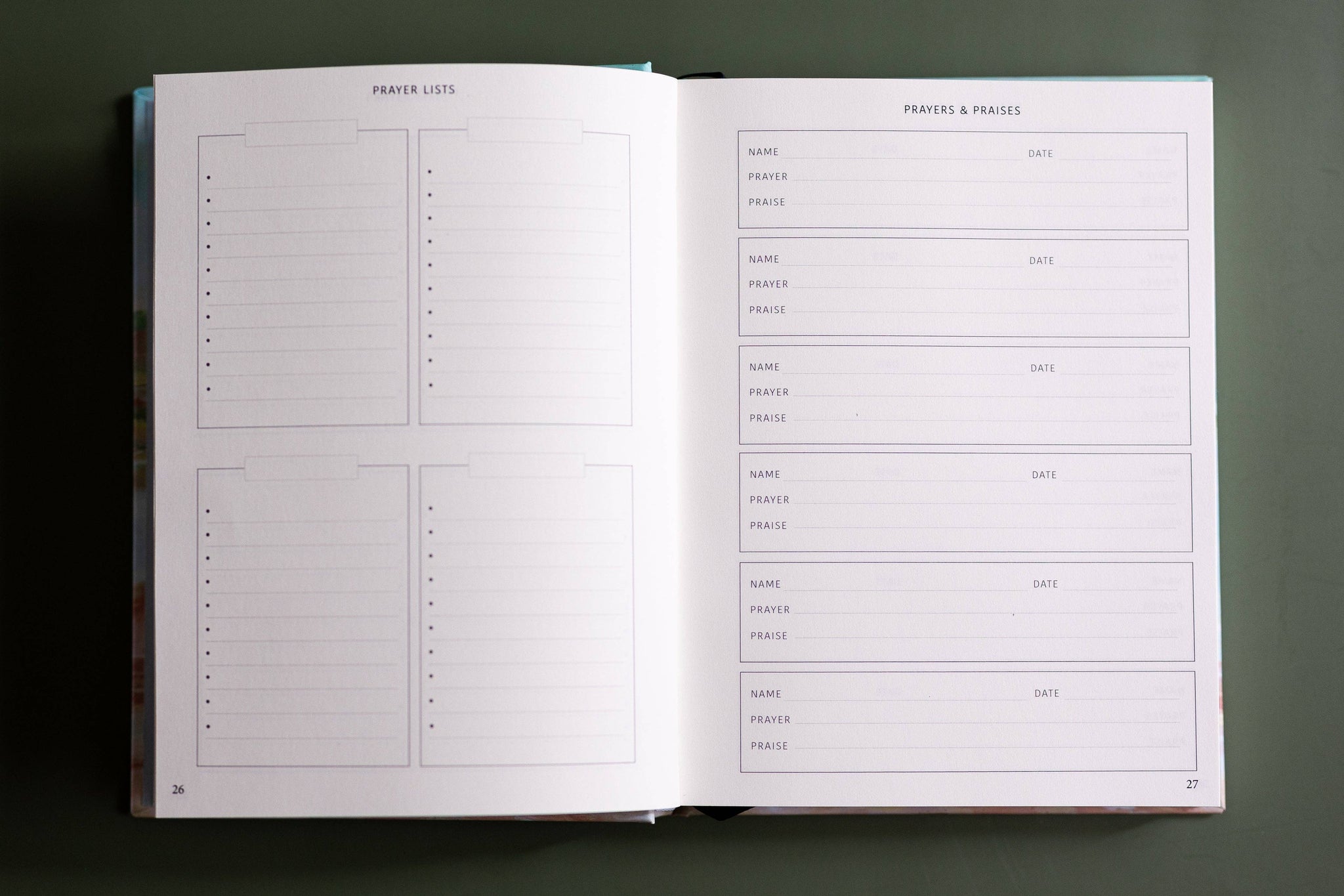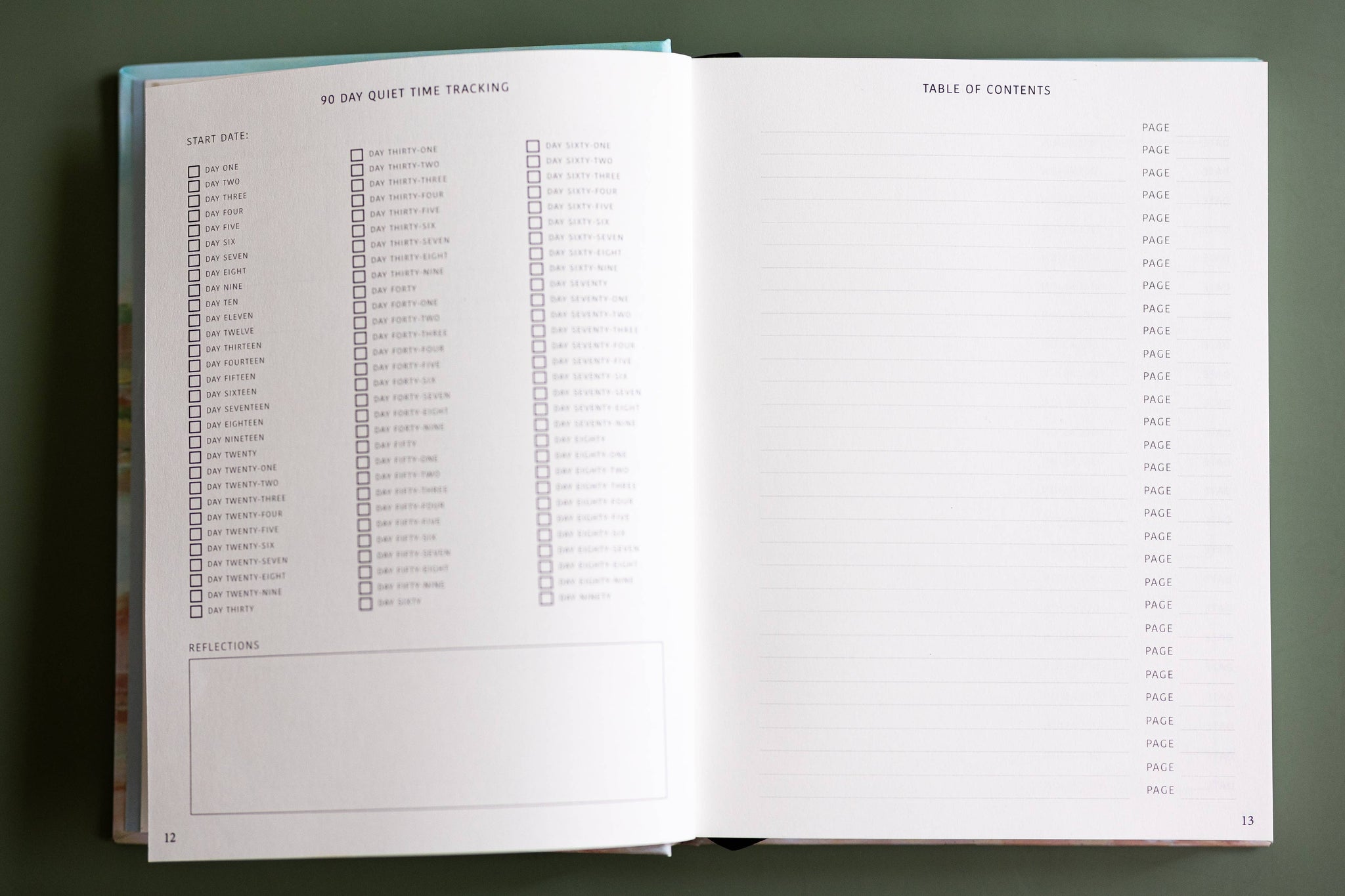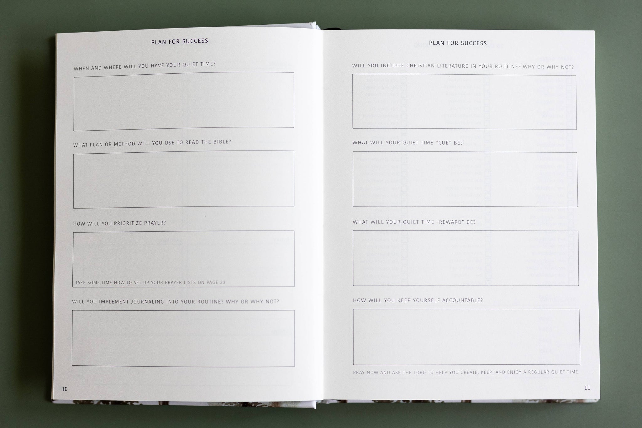 The Quiet Time Companion is a planner and journal for your daily time with Jesus! Keep all of your prayer lists, memorization goals, church notes, daily journal entries, and more, neatly organized within the pages of this lovely and thoughtful notebook