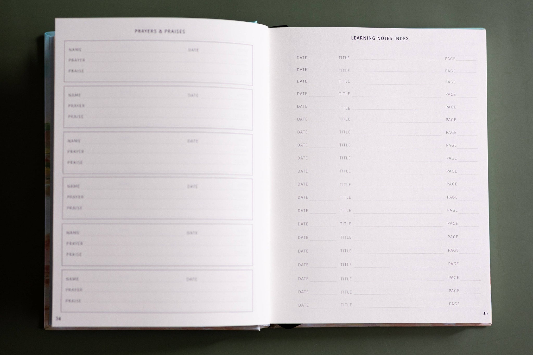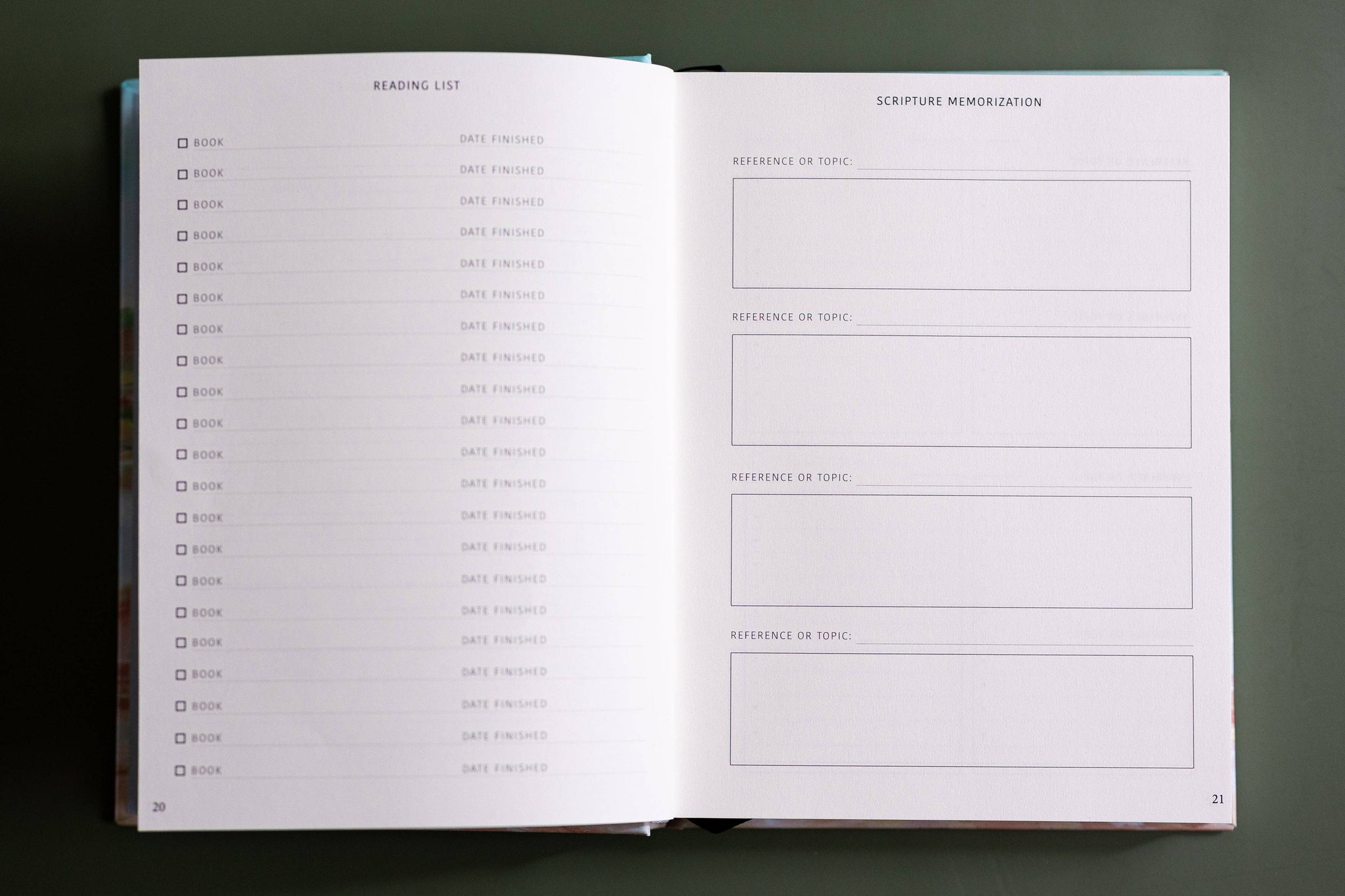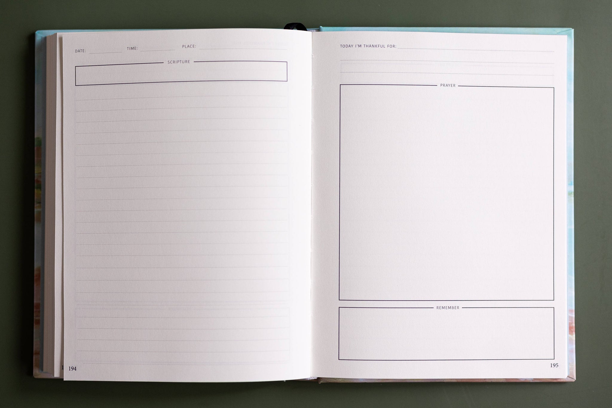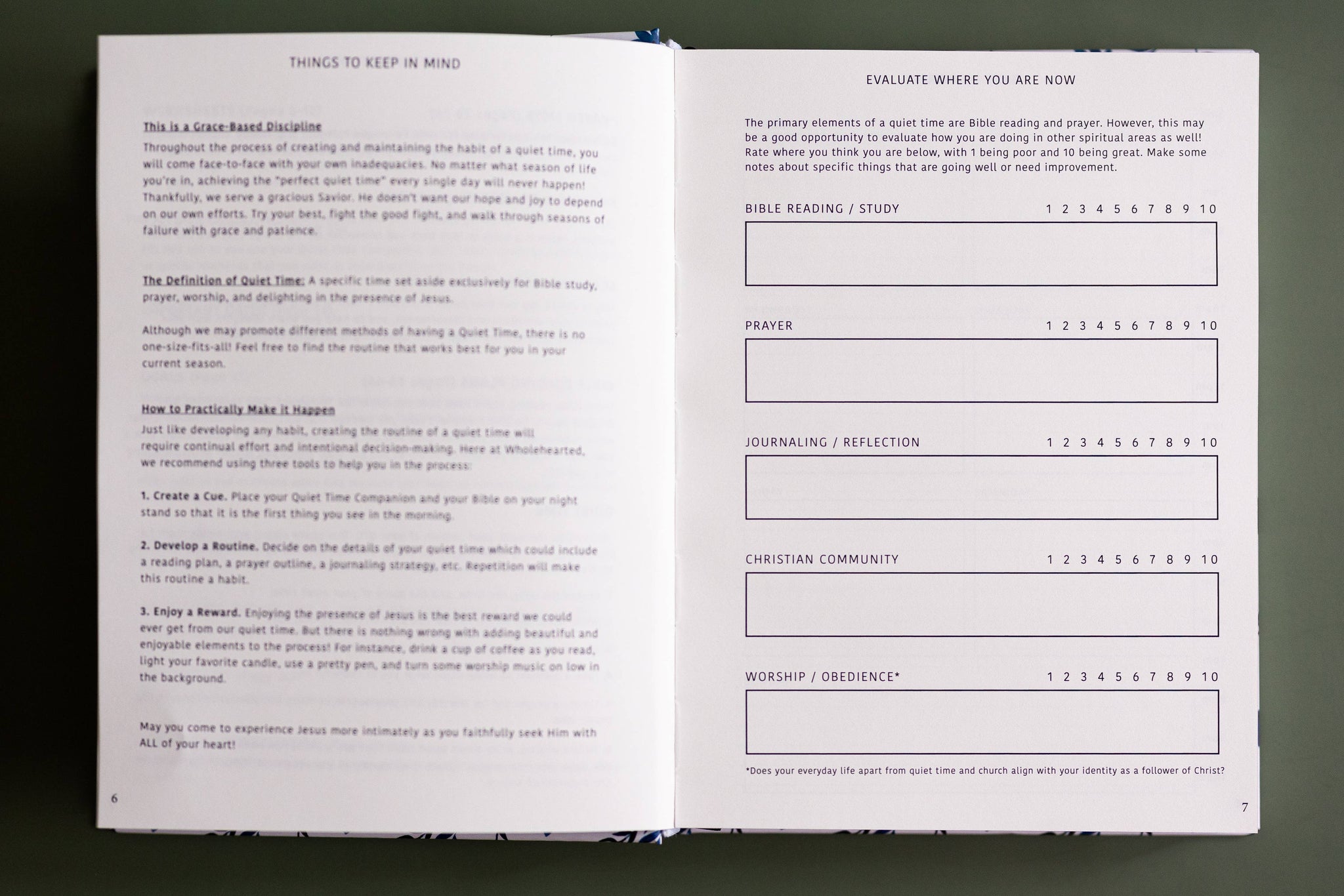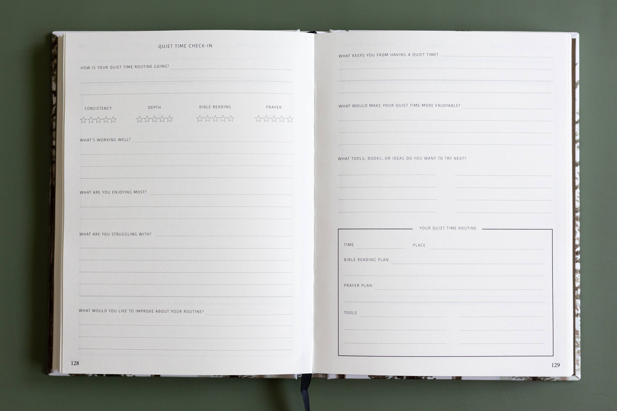 The Quiet Time Companion is a planner and journal for your daily time with Jesus! Keep all of your prayer lists, memorization goals, church notes, daily journal entries, and more, neatly organized within the pages of this lovely and thoughtful notebook