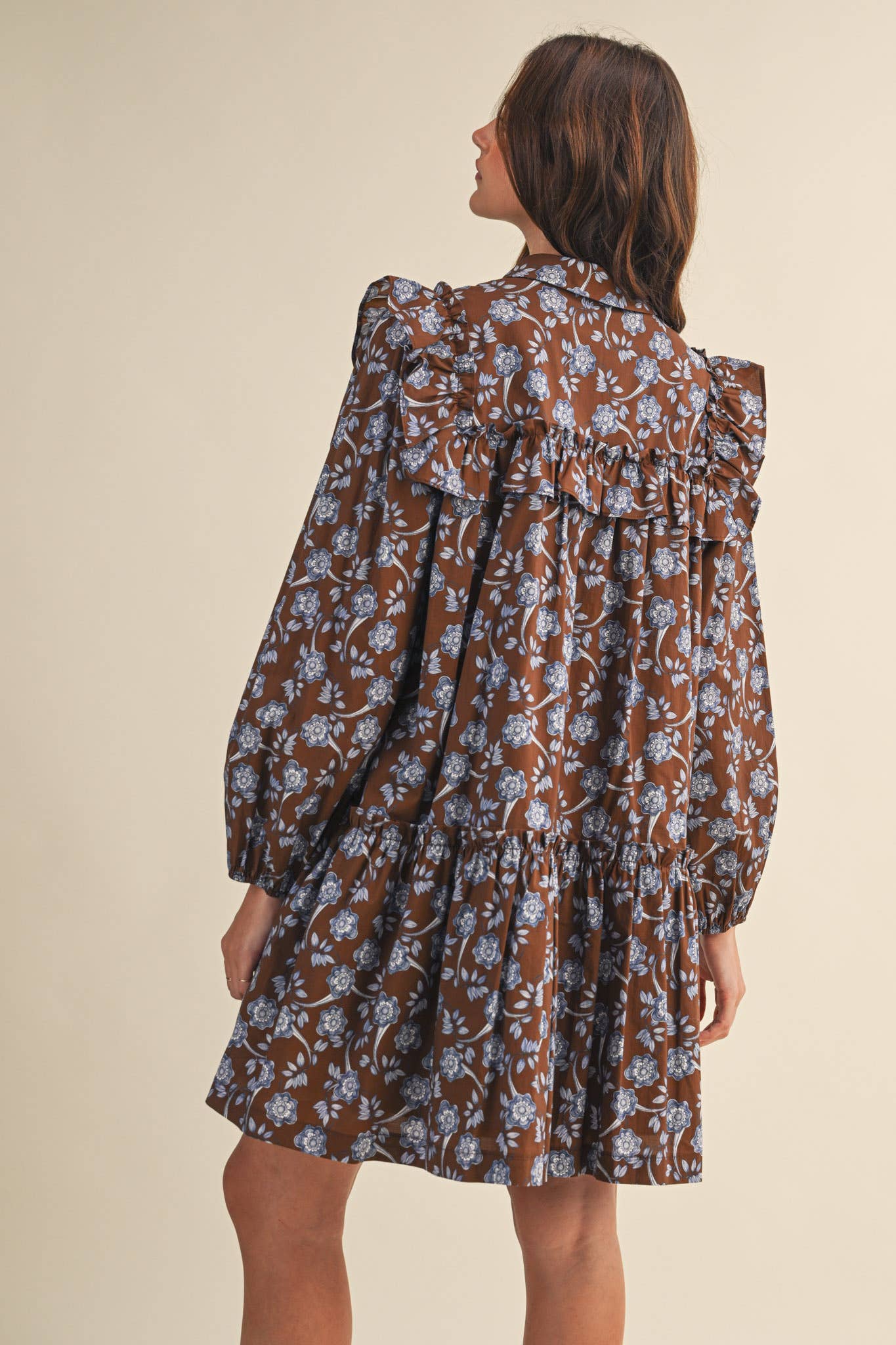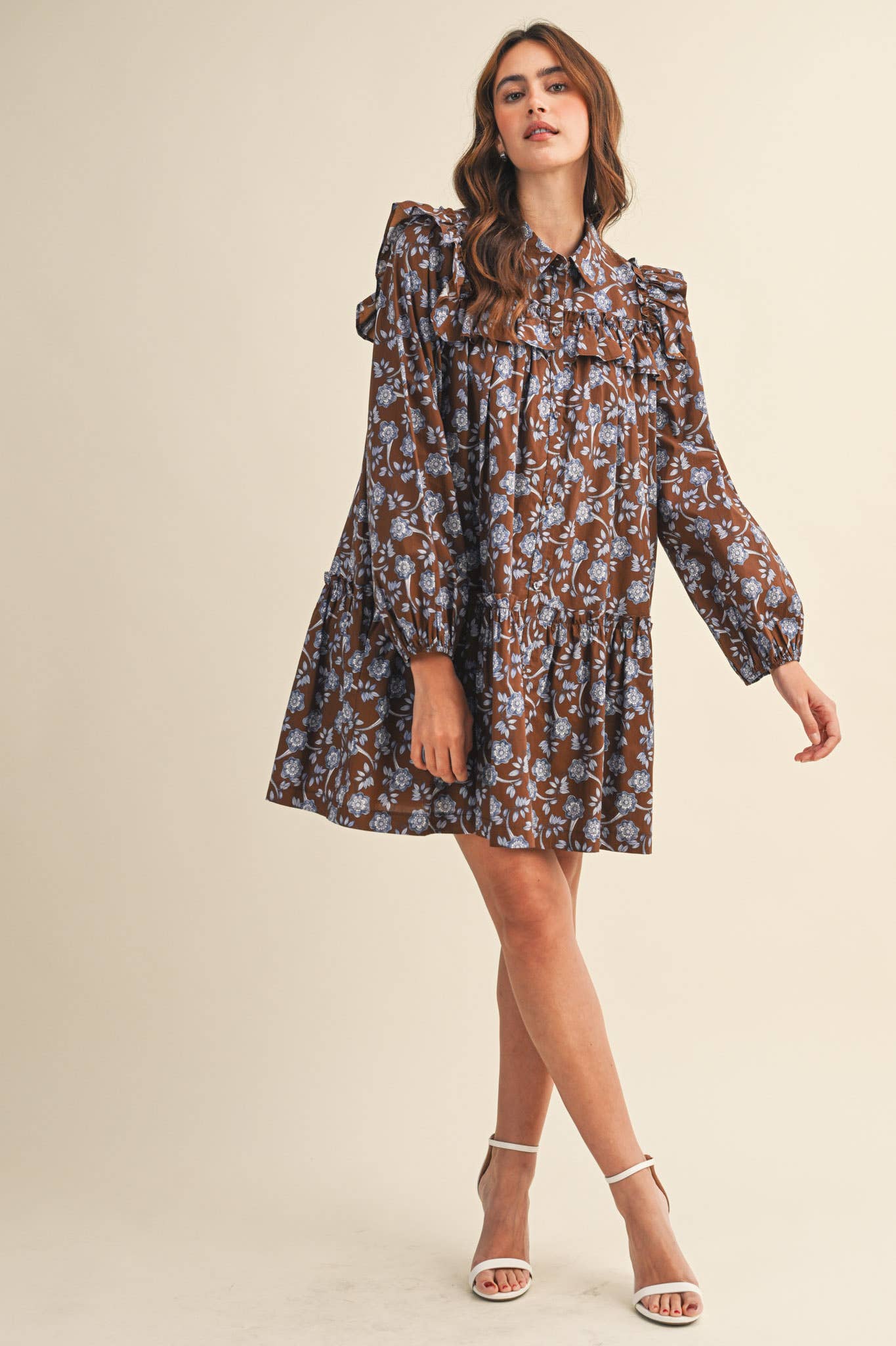 + Ruffle trim button down mini dress + Vintage floral fabric + Collared neckline with button down placket + Ruffle trim yoke + Long puff sleeves with elastic cuffs + Drop waist with ruffle trim + Pockets + Lined + Model is 5' 7.5" 33-24-34 and wears a S