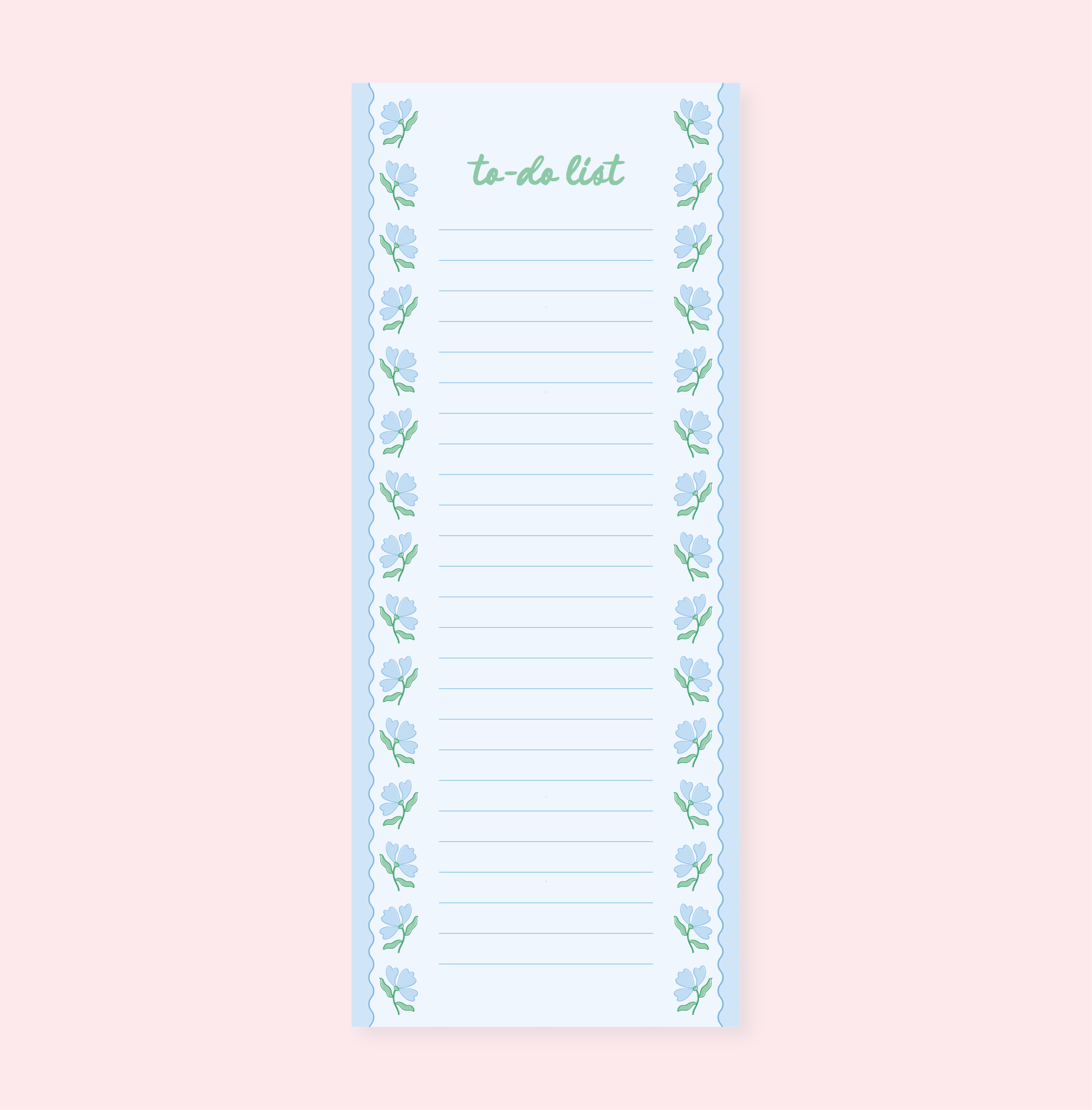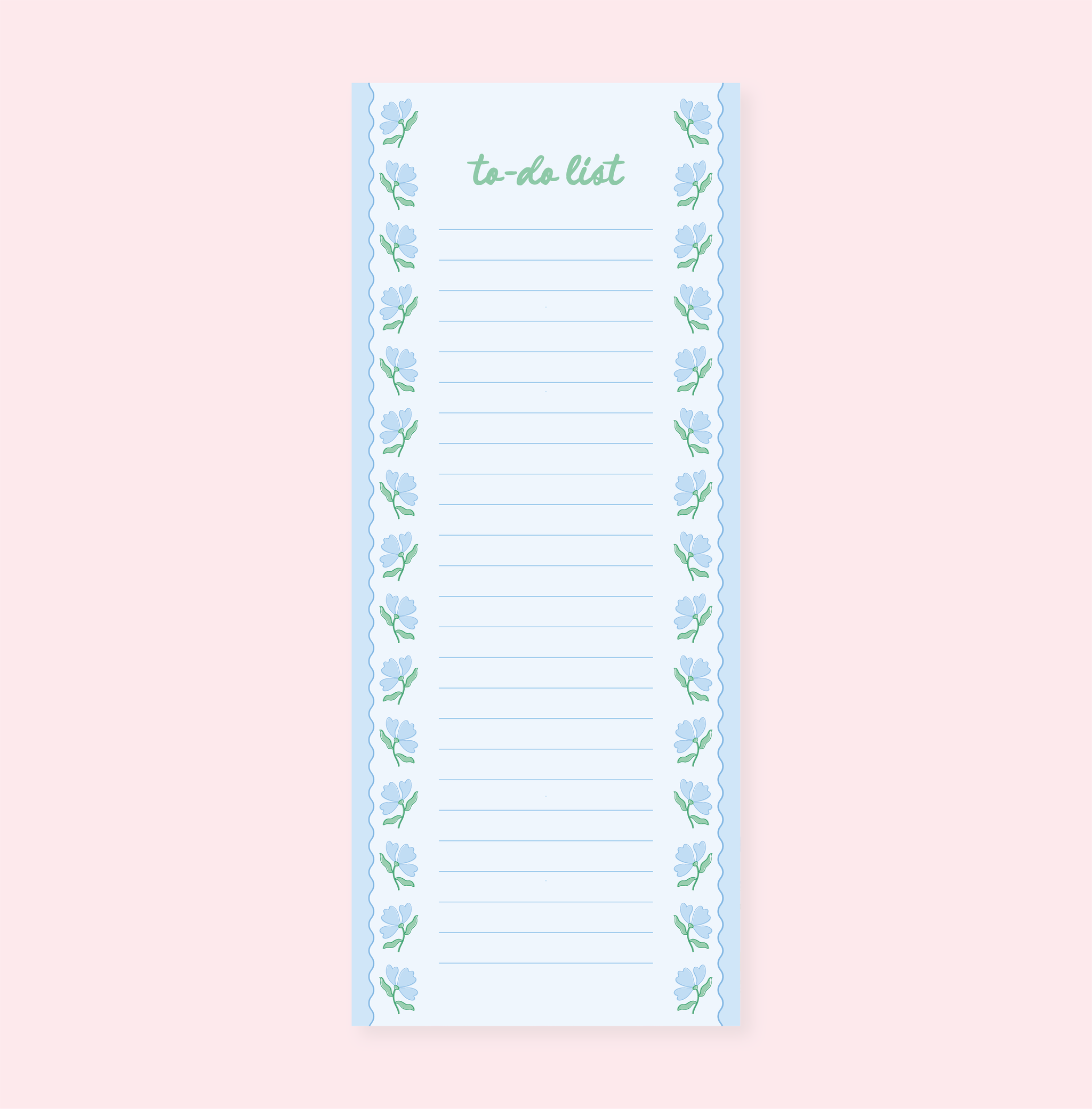This Blue Flower Wavy List Notepad is perfect for jotting down notes, to-do lists, or reminders, adding a touch of sweetness to your everyday tasks. 50 sheets 3.5" x 8.5" Glued top edge