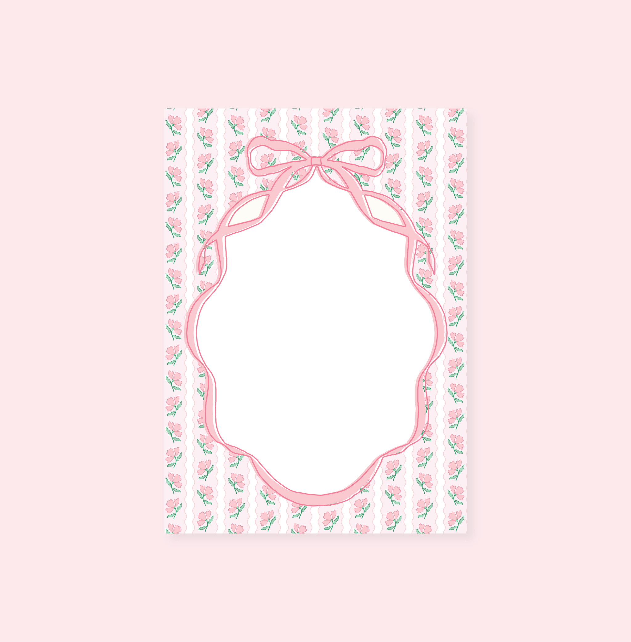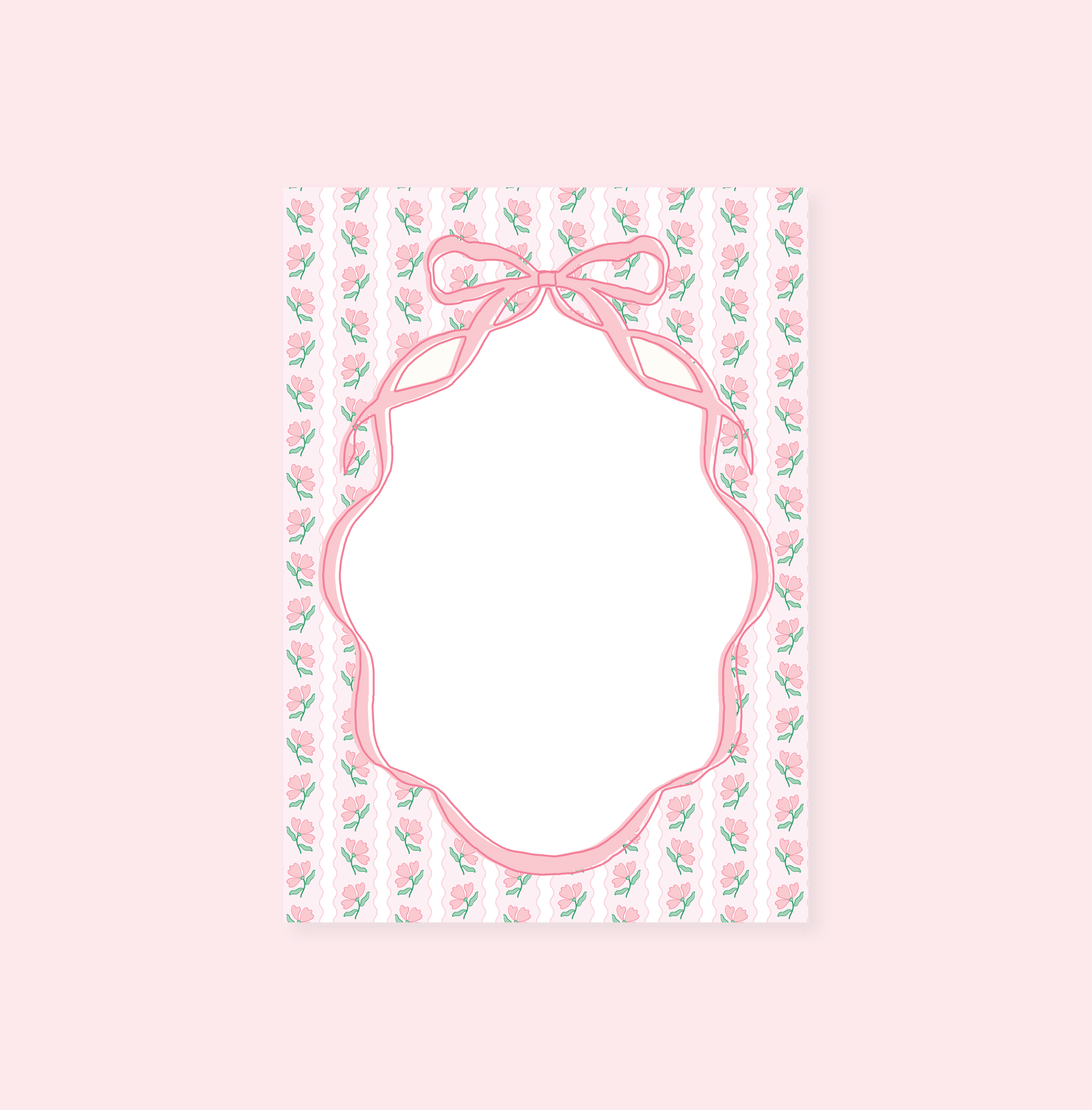 This Pink Flower Ribbon Notepad is perfect for jotting down notes, to-do lists, or reminders, adding a touch of fun to your everyday tasks. 50 sheets 5" x 7 in Glued top edge