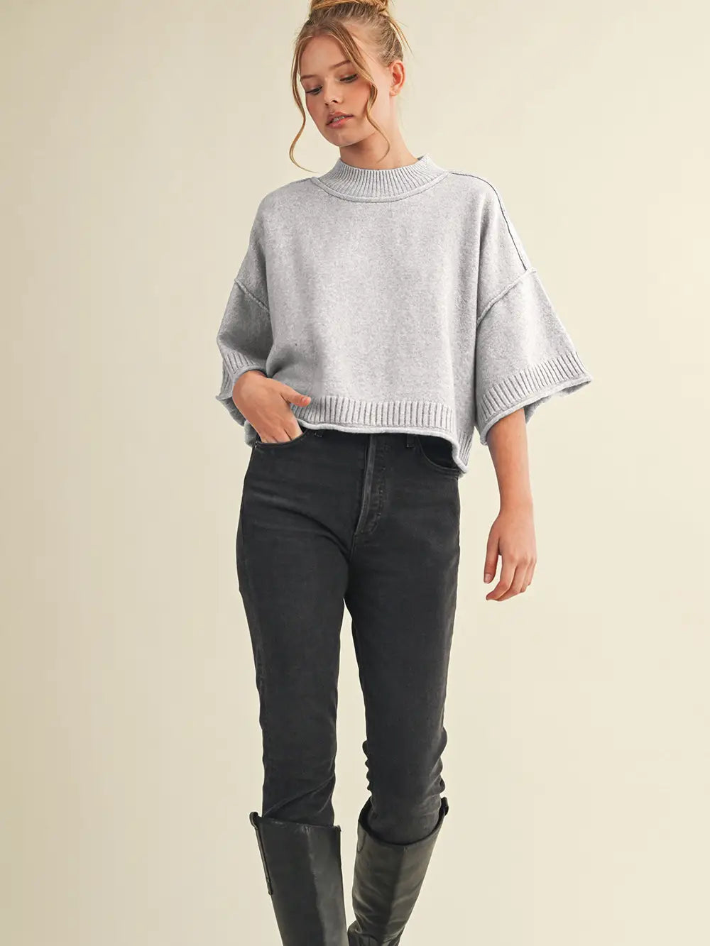 + Marled knit mock neck short sleeve sweater + Ribbed mock neckline + Raw edge seam detail + Wide short sleeves with rubbed cuffs + Semi-cropped bodice + Ribbed neckline, cuffs, and hem + Model is 5' 7.5" 30-25-36 and wears a S