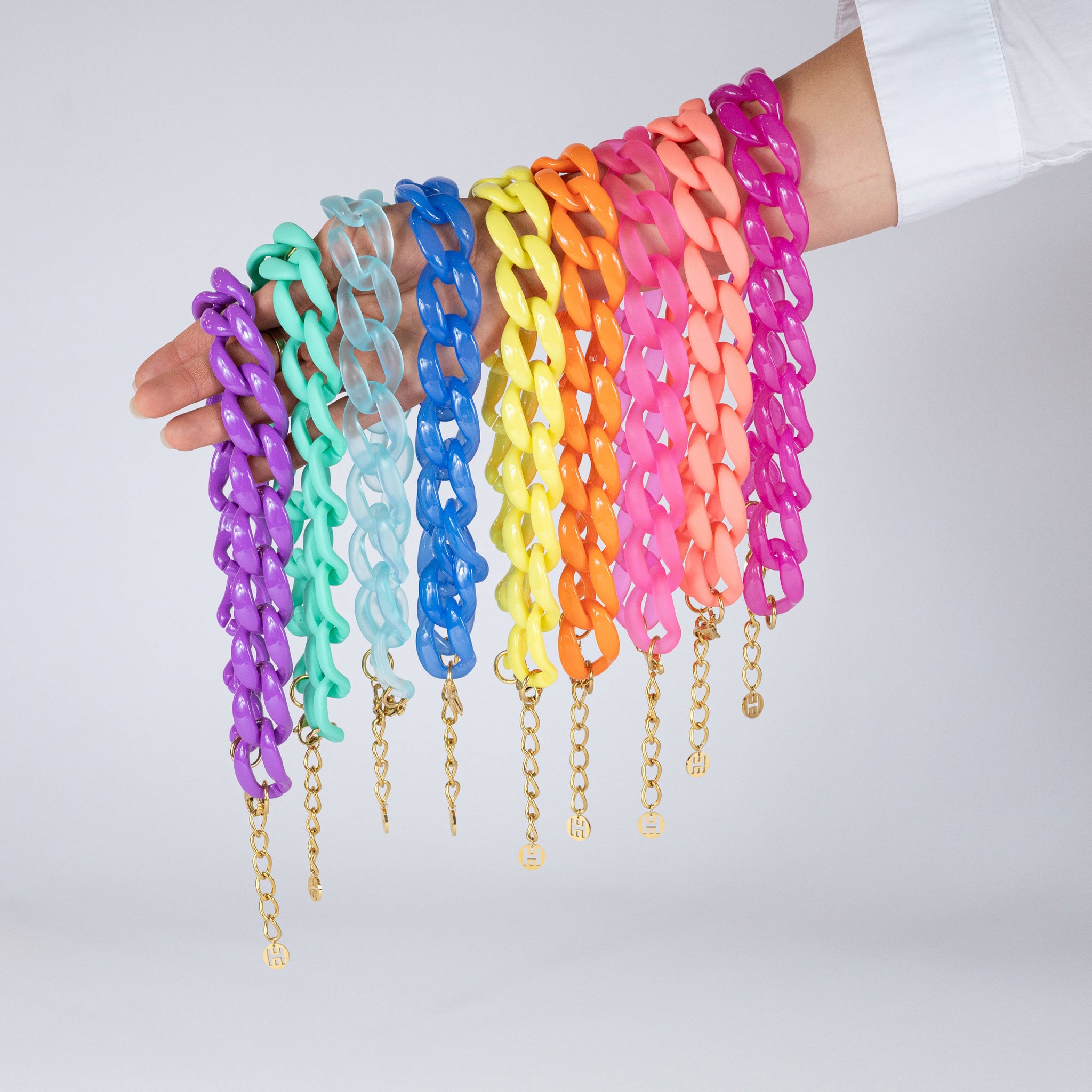 Bold yet lightweight, the Acrylic Chain Necklace is your go-to statement piece for everyday edge or elevated styling. Designed with oversized links and a high-gloss finish, it layers effortlessly or stands strong solo. Finished with a polished gold-tone extender and Hoo Hoops charm for a signature touch.