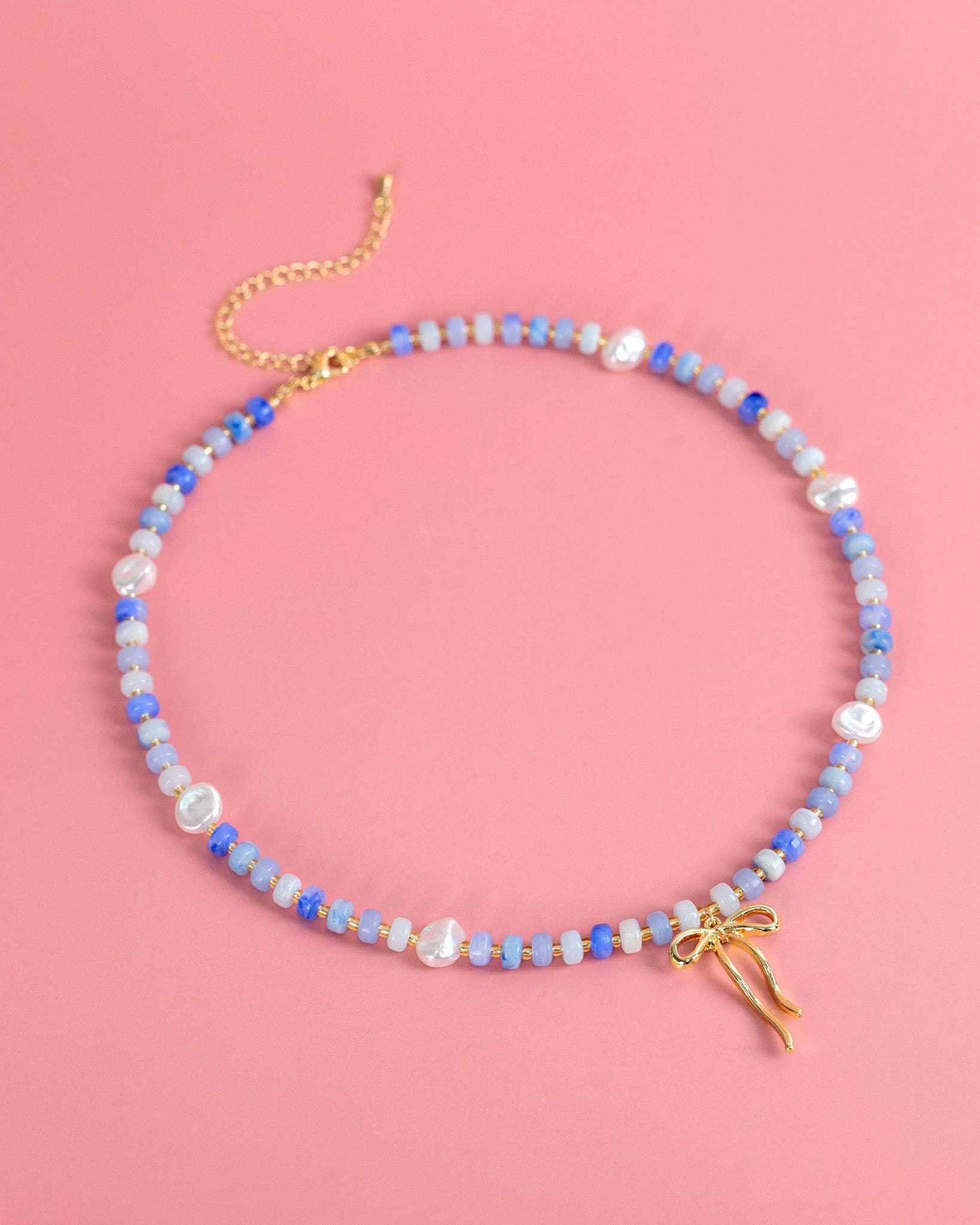 [SESSORI EXCLUSIVE] Like if your jewelry box had a crush. All blushy pastels, pearly glow, and just enough sparkle to flirt with the sunlight. Material: ACRYLI 50% GLASS 20% ZINC 20% ACRYLI PEARL 5% IRON 5% Size: 16"+3", PENDANT 20*29MM