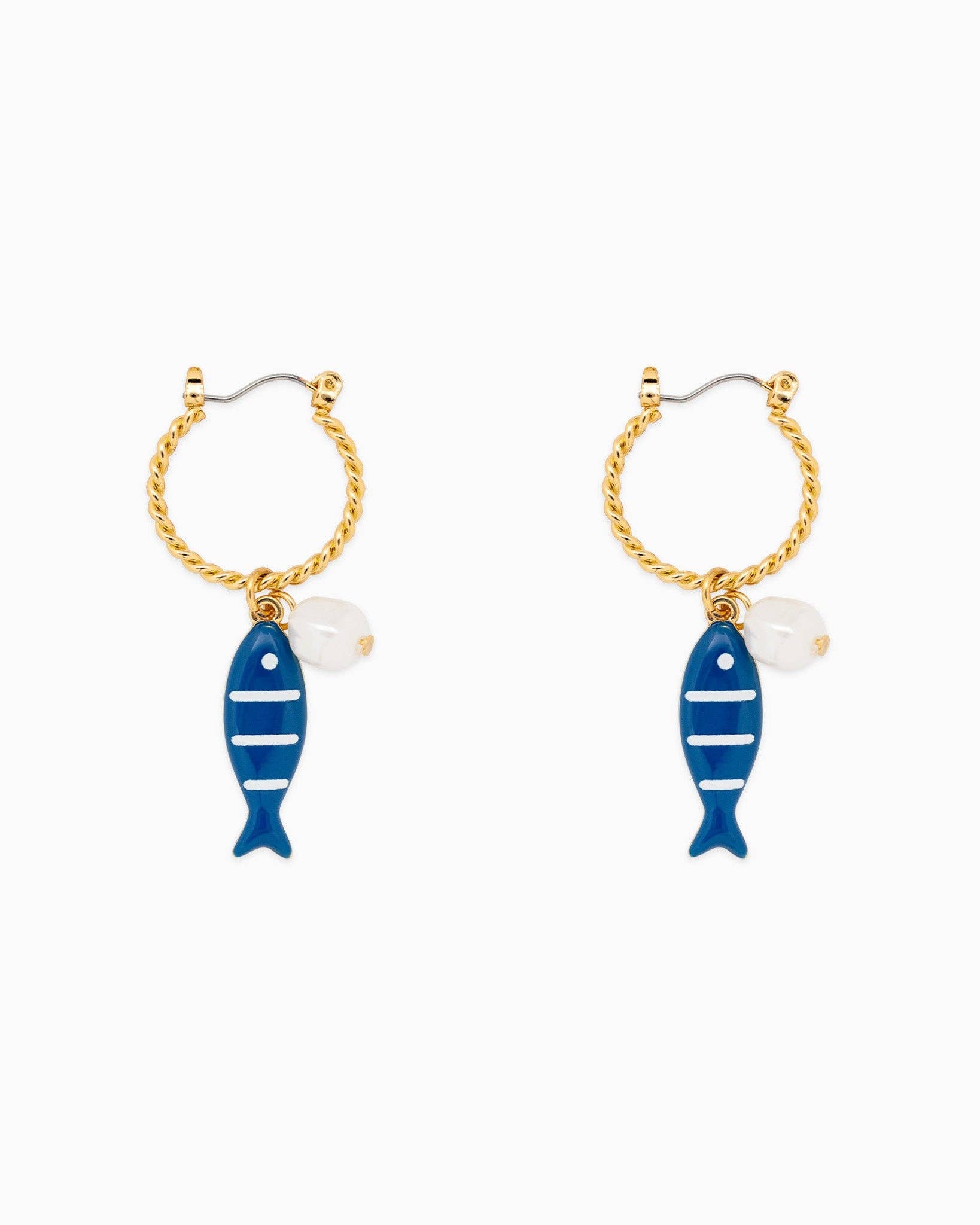 Gold rope hoops adorned with striped fish charms and pearl drops—playful, breezy, and perfect for resort-ready styling with a splash of coastal charm Material: Zinc, Steel, Enamel, Acrylic Pearl Size: 20*50MM