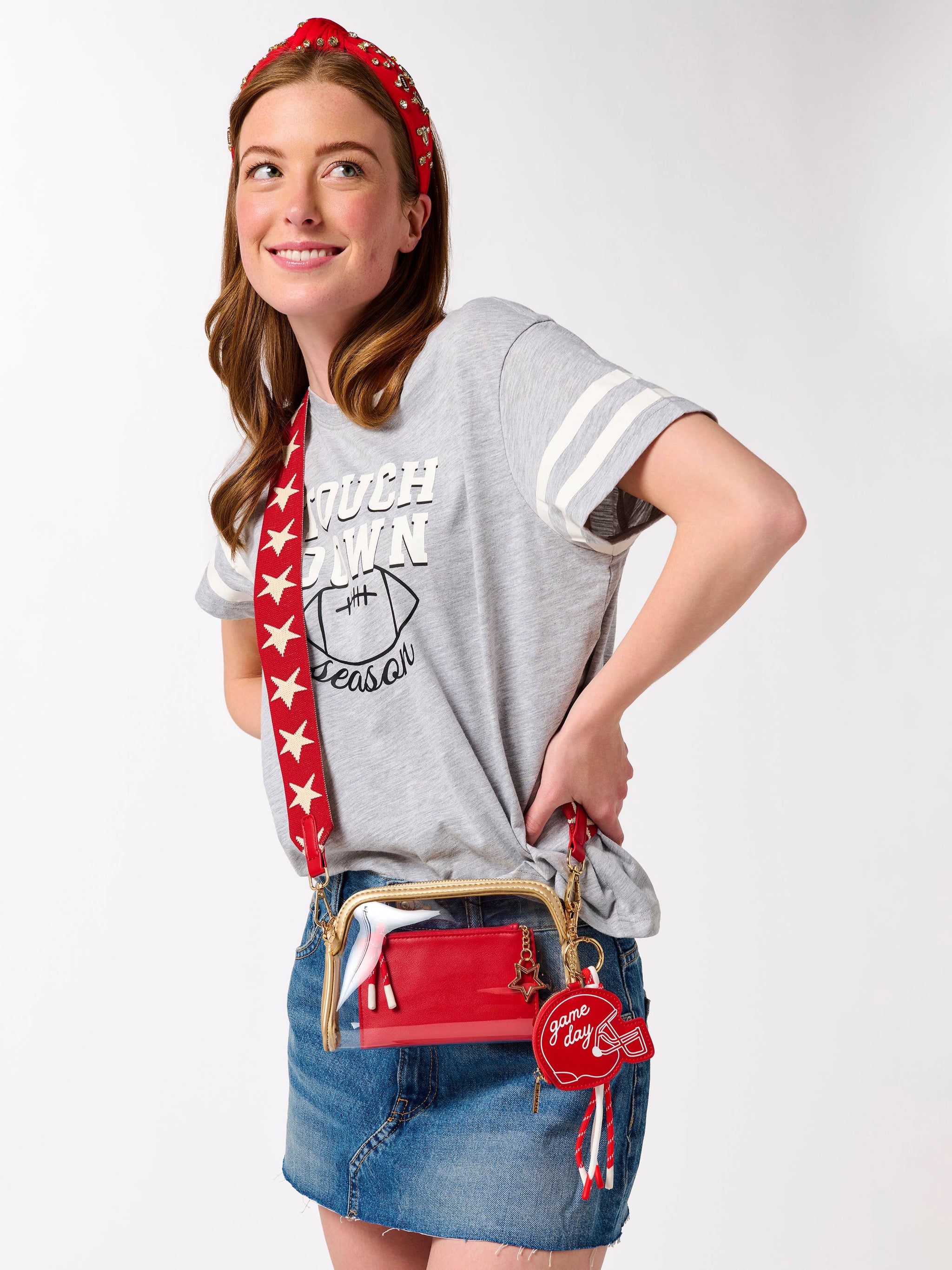 Meet the Taylor Cross-body – your go-to bag for stadium games, concerts, or any event where style and security go hand-in-hand. Made from sleek, transparent PU, this compact cutie is perfect for storing your essentials while staying event-compliant. It features a chic gold chain strap with a vegan leather shoulder detail that’s both comfy and detachable. Swap out the strap to mix and match with your favorite accessories for a personalized twist.. Made from TPU and smooth PU with gold hardware