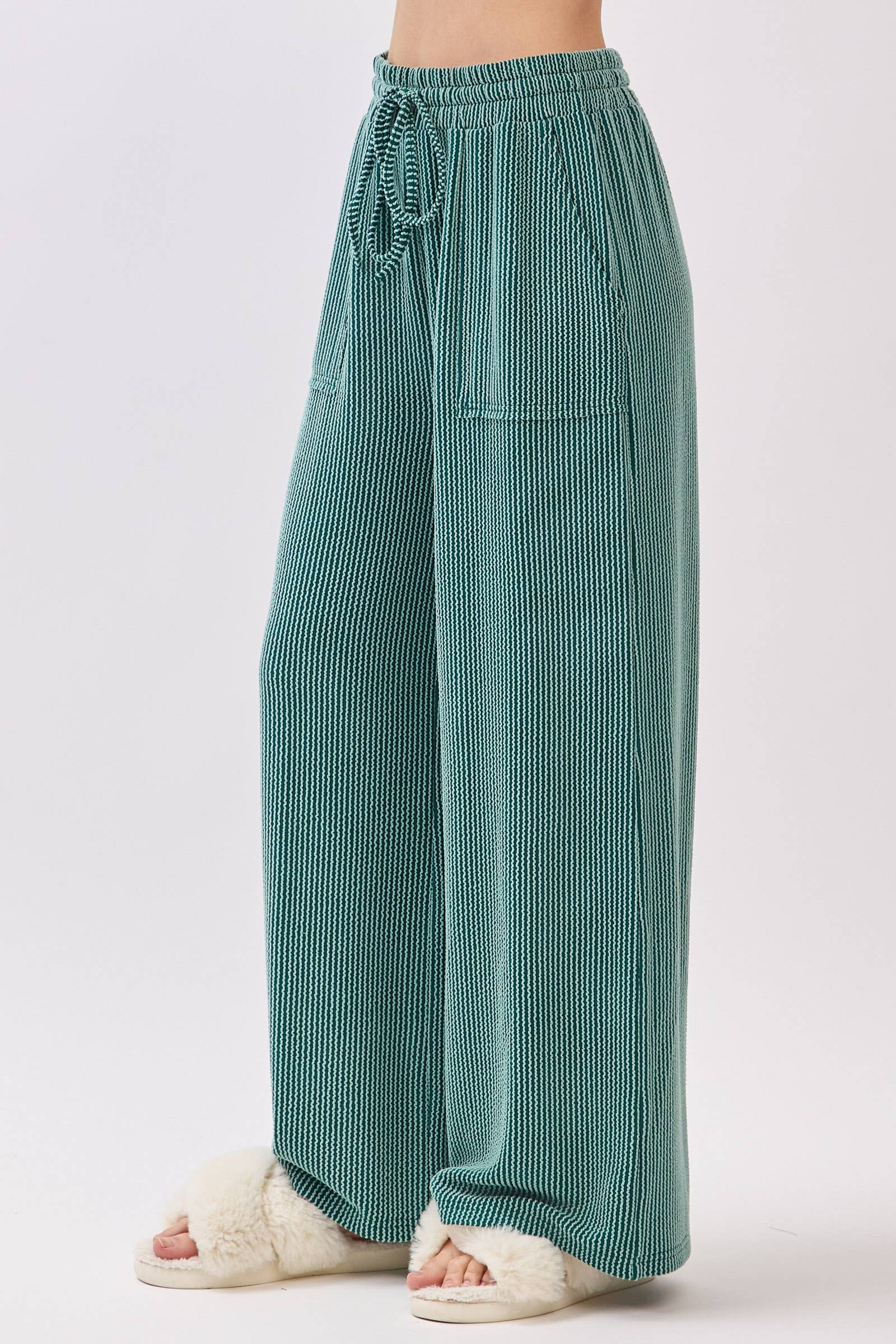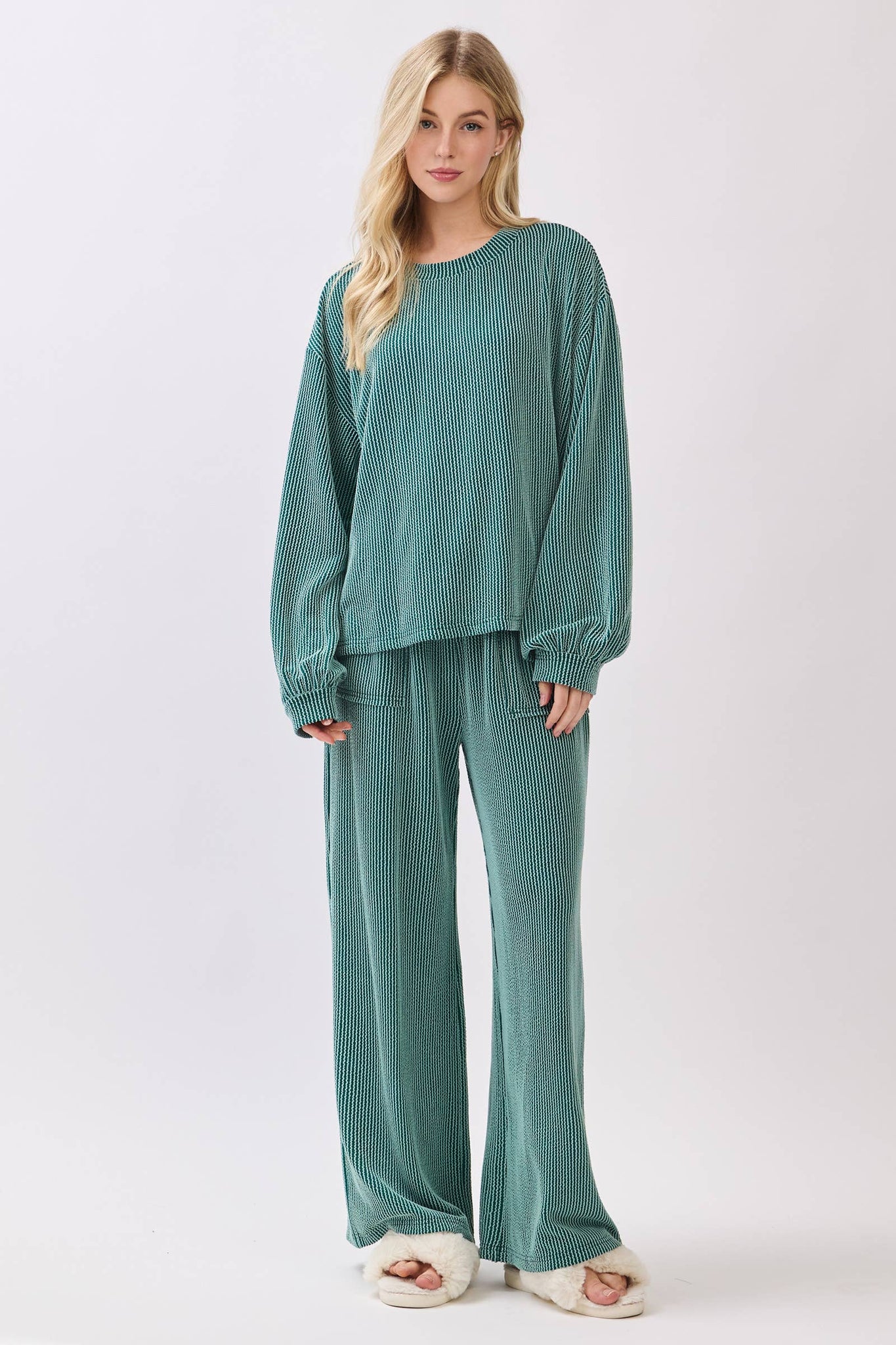Teal Ribbed Knit Top and Wide Leg Pants Set